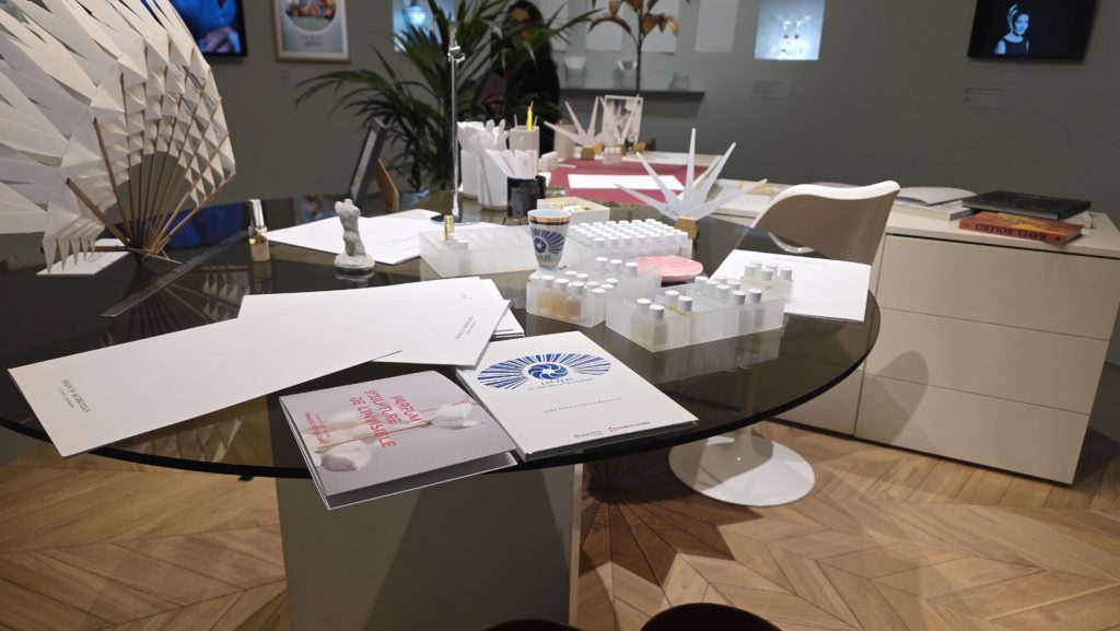 Autre curiosité : la proposition de boire une « eau parfumée », intitulée L’Or bleu, et de déguster un chocolat, partie intégrante de l’installation « multisensorielle » L’Alchimie des sens, construite autour du célèbre parfum Baccarat Rouge 540. Est aussi proposée une expérience en réalité virtuelle, mais je n’avais pas pris le billet adéquat. En fin de visite est reproduit le bureau-atelier de Francis Kurkdjian, sur lequel on trouve dans un désordre organisé nombre de flacons et de touches à sentir. Les fragrances commerciales de la maison, elles, ont droit de cité accompagnée des oeuvres de Christelle Boulé, qui en a utilisé quelques gouttes pour créer des oeuvres abstraites toutes en couleurs. De quoi se familiariser avec ces odeurs avant de les retrouver, vous avez deviné… À la boutique. Si l’argent n’a pas d’odeur, les odeurs, c’est de l’argent.
